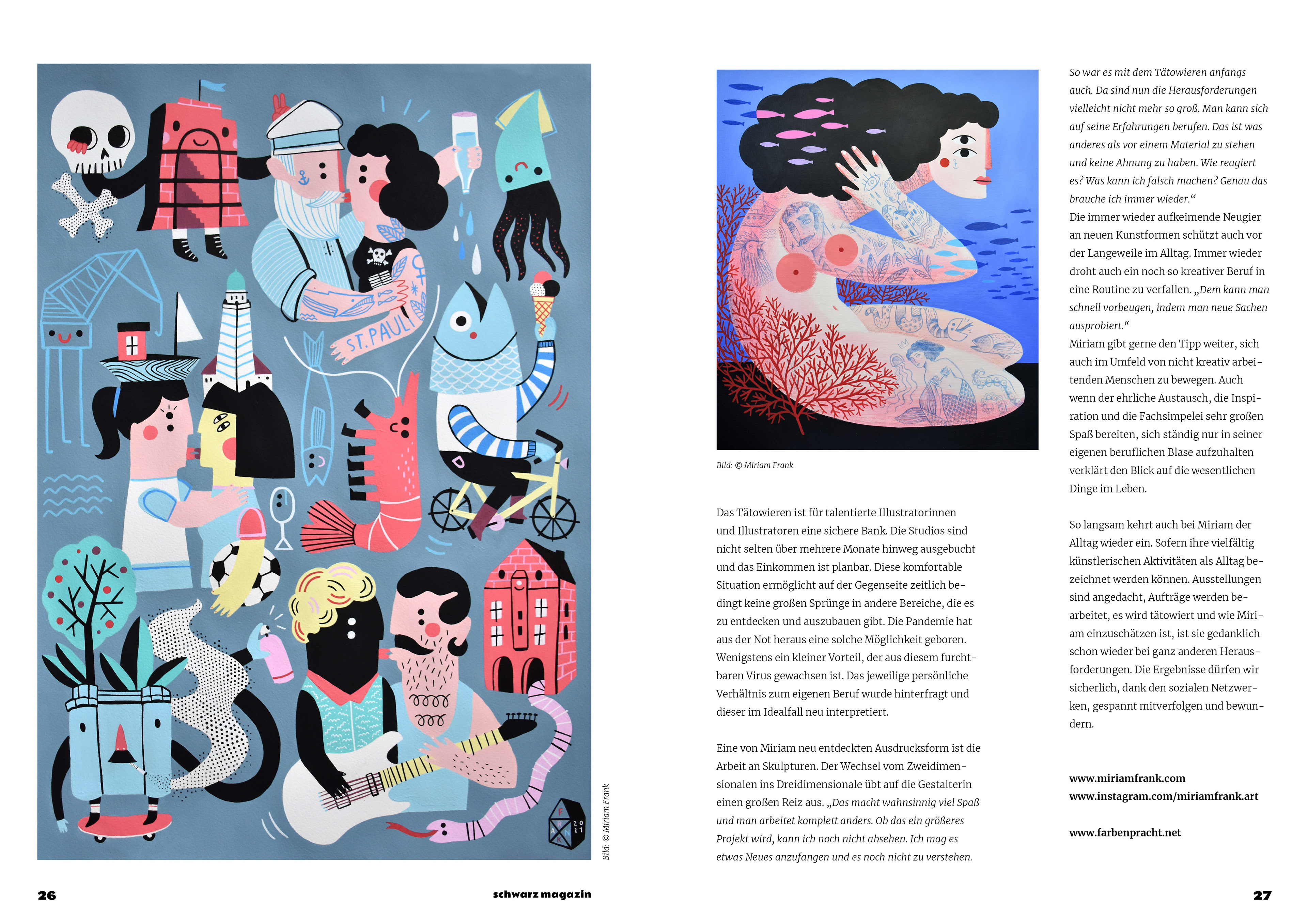 Alternativ zu den gestalterischen Berufen beschäftigt sich Miriam mit Meeresbiologie und überlegt vielleicht diese Richtung einzuschlagen. Auch heute noch ist diese Themenwelt sehr präsent in Miriams Arbeit. „Schließlich möchte man ja nicht das machen was die Eltern machen. Aber am Ende hat mir das Kreative wahnsinnig viel Spaß gemacht. Auch Kunstpädagogik war ein Thema. Das Soziale fehlte mir im Designbereich. Illustration beispielsweise ist ein recht einsamer Beruf. Heute hole ich mir die soziale Komponente durch das Tätowieren.“