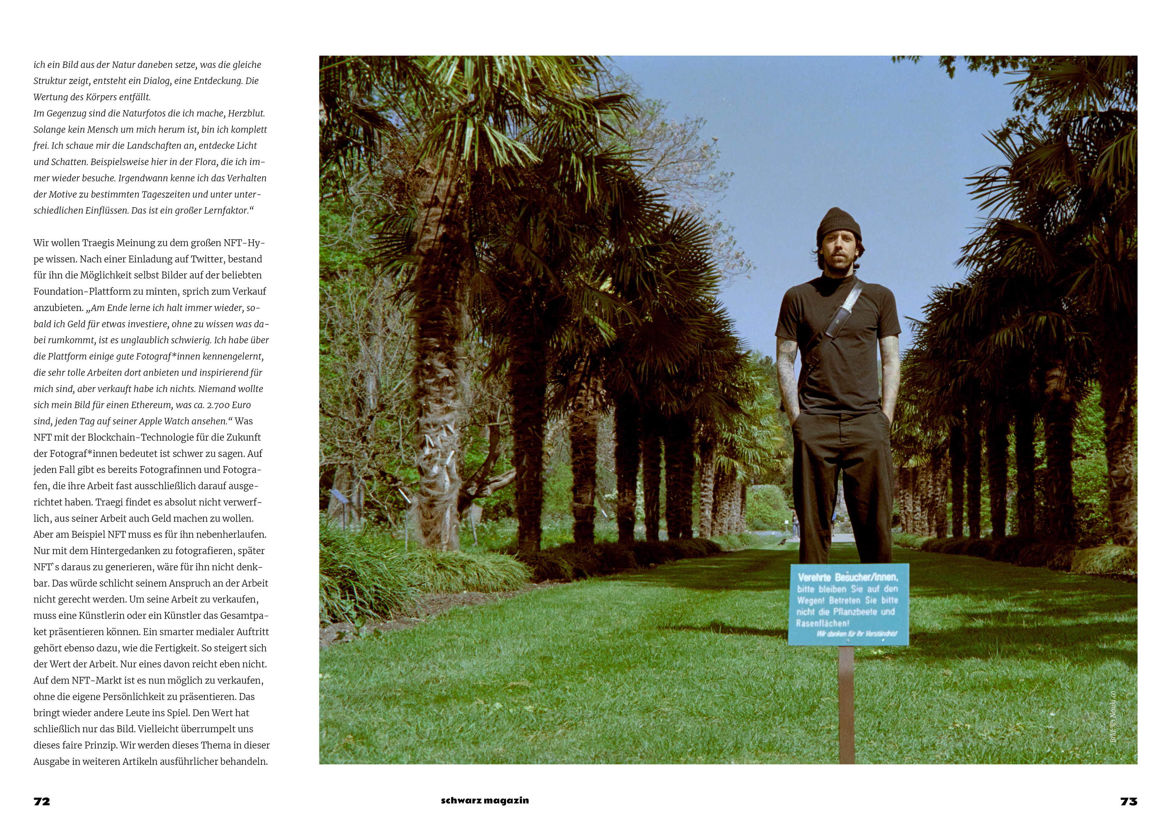 Wir wollen Traegis Meinung zu dem großen NFT-Hype wissen. Nach einer Einladung auf Twitter, bestand für ihn die Möglichkeit selbst Bilder auf der beliebten Foundation-Plattform zu minten, sprich zum Verkauf anzubieten. „Am Ende lerne ich halt immer wieder, sobald ich Geld für etwas investiere, ohne zu wissen was dabei rumkommt, ist es unglaublich schwierig. Ich habe über die Plattform einige gute Fotograf*innen kennengelernt, die sehr tolle Arbeiten dort anbieten und inspirierend für mich sind, aber verkauft habe ich nichts. Niemand wollte sich mein Bild für einen Ethereum, was ca. 2.700 Euro sind, jeden Tag auf seiner Apple Watch ansehen.“ Was NFT mit der Blockchain-Technologie für die Zukunft der Fotograf*innen bedeutet ist schwer zu sagen. Auf jeden Fall gibt es bereits Fotografinnen und Fotografen, die ihre Arbeit fast ausschließlich darauf ausgerichtet haben. Traegi findet es absolut nicht verwerflich, aus seiner Arbeit auch Geld machen zu wollen. Aber am Beispiel NFT muss es für ihn nebenherlaufen. Nur mit dem Hintergedanken zu fotografieren, später NFT`s daraus zu generieren, wäre für ihn nicht denkbar. Das würde schlicht seinem Anspruch an der Arbeit nicht gerecht werden. Um seine Arbeit zu verkaufen, muss eine Künstlerin oder ein Künstler das Gesamtpaket präsentieren können. Ein smarter medialer Auftritt gehört ebenso dazu, wie die Fertigkeit. So steigert sich der Wert der Arbeit. Nur eines davon reicht eben nicht. Auf dem NFT-Markt ist es nun möglich zu verkaufen, ohne die eigene Persönlichkeit zu präsentieren. Das bringt wieder andere Leute ins Spiel. Den Wert hat schließlich nur das Bild. Vielleicht überrumpelt uns dieses faire Prinzip. Wir werden dieses Thema in dieser Ausgabe in weiteren Artikeln ausführlicher behandeln.