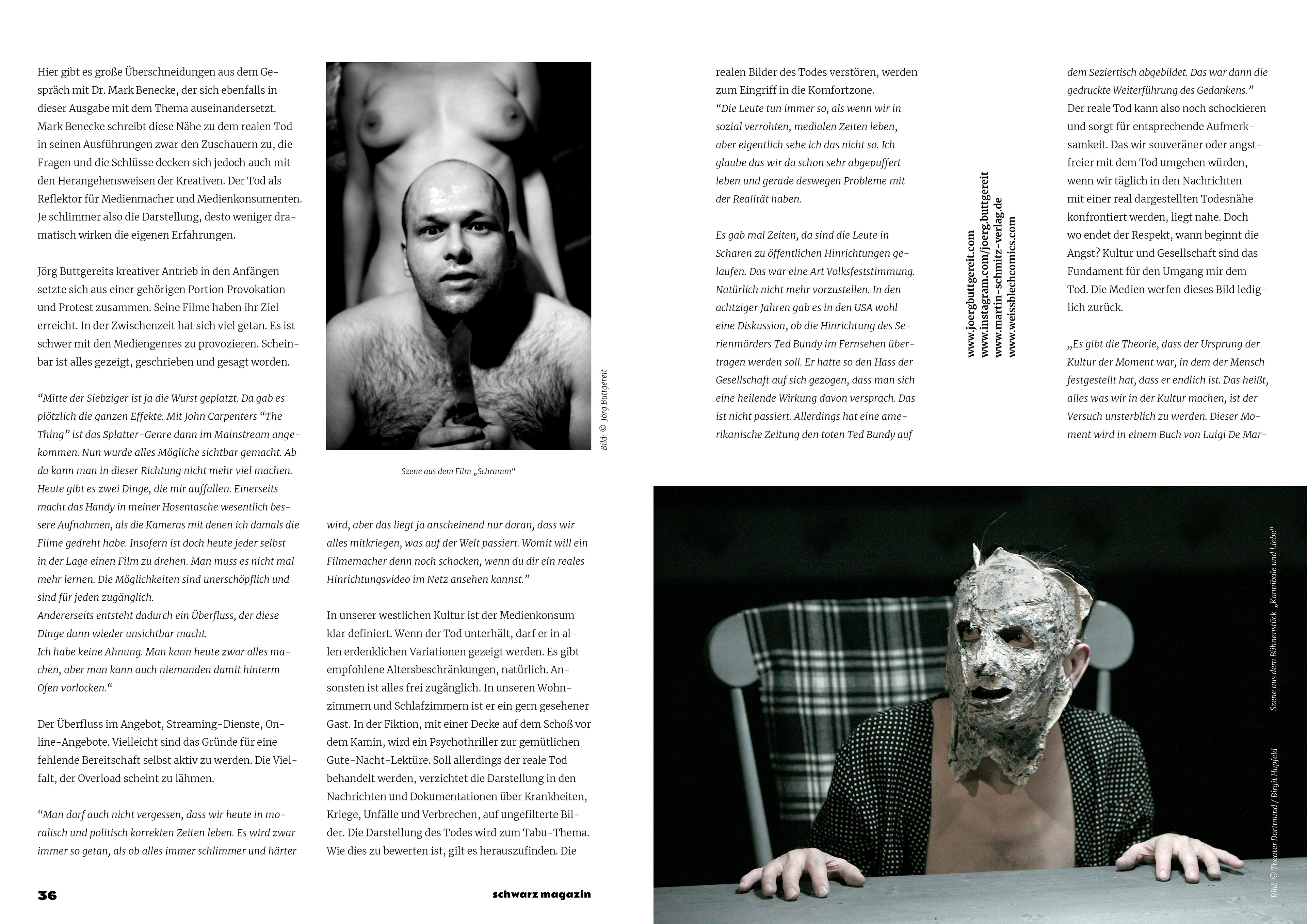 Hier gibt es große Überschneidungen aus dem Gespräch mit Dr. Mark Benecke, der sich ebenfalls in dieser Ausgabe mit dem Thema auseinandersetzt. Mark Benecke schreibt diese Nähe zu dem realen Tod in seinen Ausführungen zwar den Zuschauern zu, die Fragen und die Schlüsse decken sich jedoch auch mit den Herangehensweisen der Kreativen. Der Tod als Reflektor für Medienmacher und Medienkonsumenten. Je schlimmer also die Darstellung, desto weniger dramatisch wirken die eigenen Erfahrungen.